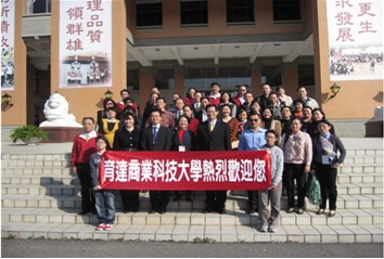 臺(tái)灣育達(dá)商業(yè)科技大學(xué)成立于1955年,是一個(gè)規(guī)劃雄偉美麗、學(xué)習(xí)環(huán)境鋪陳的十分人性化的校園。學(xué)校董事長(zhǎng)、校長(zhǎng)、教導(dǎo)主任在學(xué)校歡迎了我們。董事長(zhǎng)在歡迎會(huì)上致辭,簡(jiǎn)要介紹了育達(dá)商業(yè)科技大學(xué)由“務(wù)實(shí)的傳奇教育家-王廣亞” 創(chuàng)辦的六十余載的創(chuàng)建歷程。在參觀校園中,行政部主任對(duì)我們提出的后勤管理和資金來(lái)源及使用等方面的問(wèn)題均作了詳盡和實(shí)在的解答。